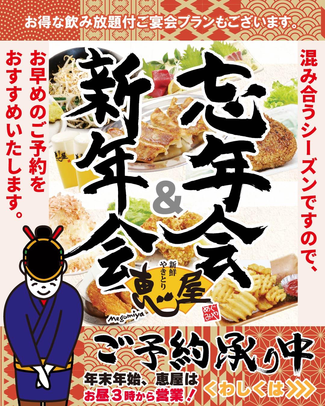 仕事納めの日や、大掃除をがんばった日の夜には、「一年おつかれさま」の気持ちを込めて恵屋での外食納めはいかがでしょうか。